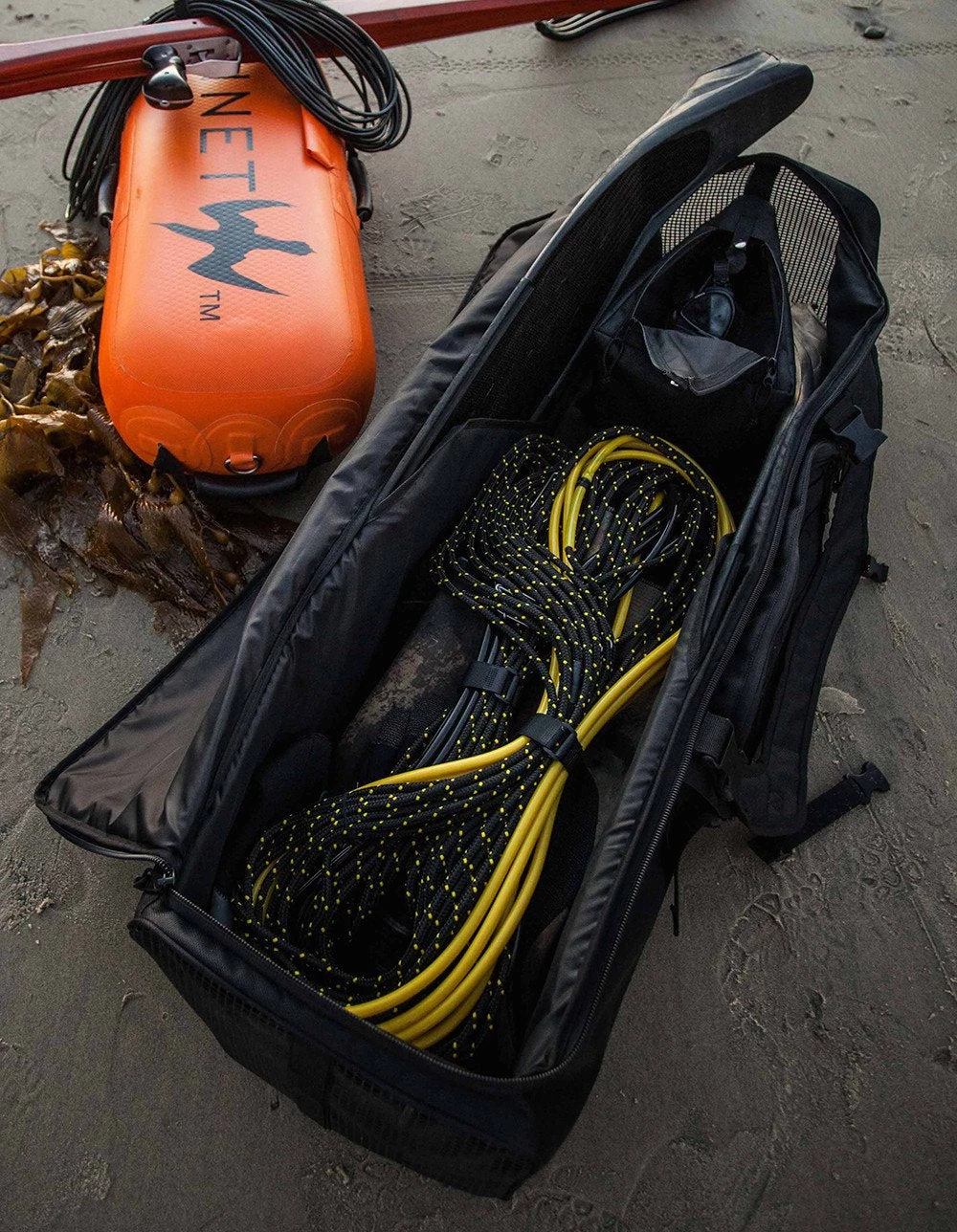 TheΒ new Gannet Kit Bag Is a ground up design for the serious freediver. Β Loaded with features it is designed to protect, organize, and carry all your gear with room to spare. Β Individual padded fin pockets that fit all long blades, padded and removable compartments for delicate things like your mask and computer, Β the Kit Bag has what you are looking for. Β Fabricated withΒ a tight weave mesh, it has padding where you need it and ventilation where you want it. Β All that and padded backpack straps for the haul through the airport or to your favorite spot.