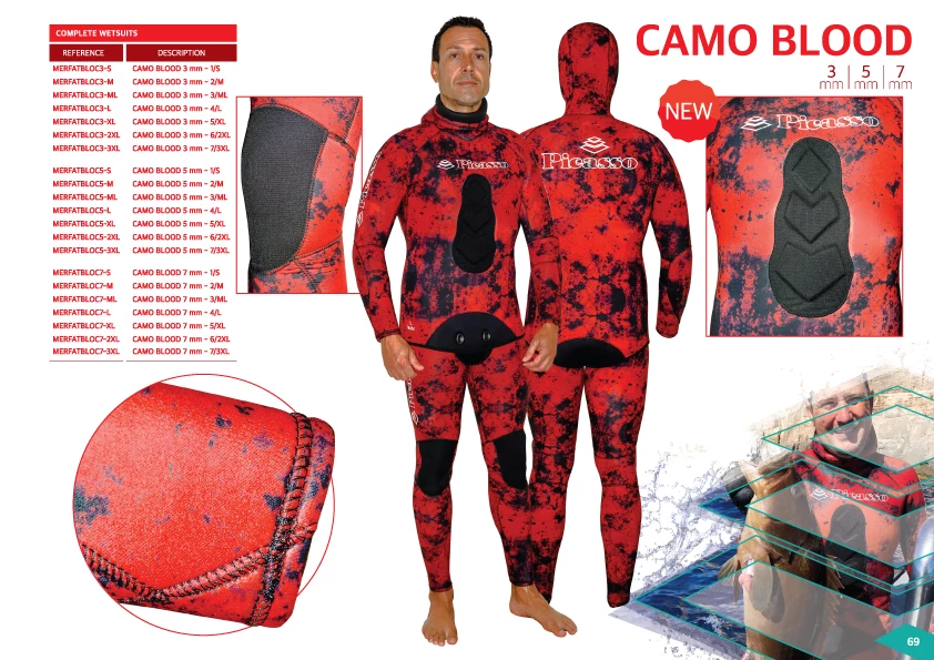 The Picasso Blood Camo wetsuit is a new 2 piece suit in red for maximum visibility on the surface. However, itβs still extremely well camouflaged underwater as the colour red is the 1st to disappear after a depth of 15 feet.