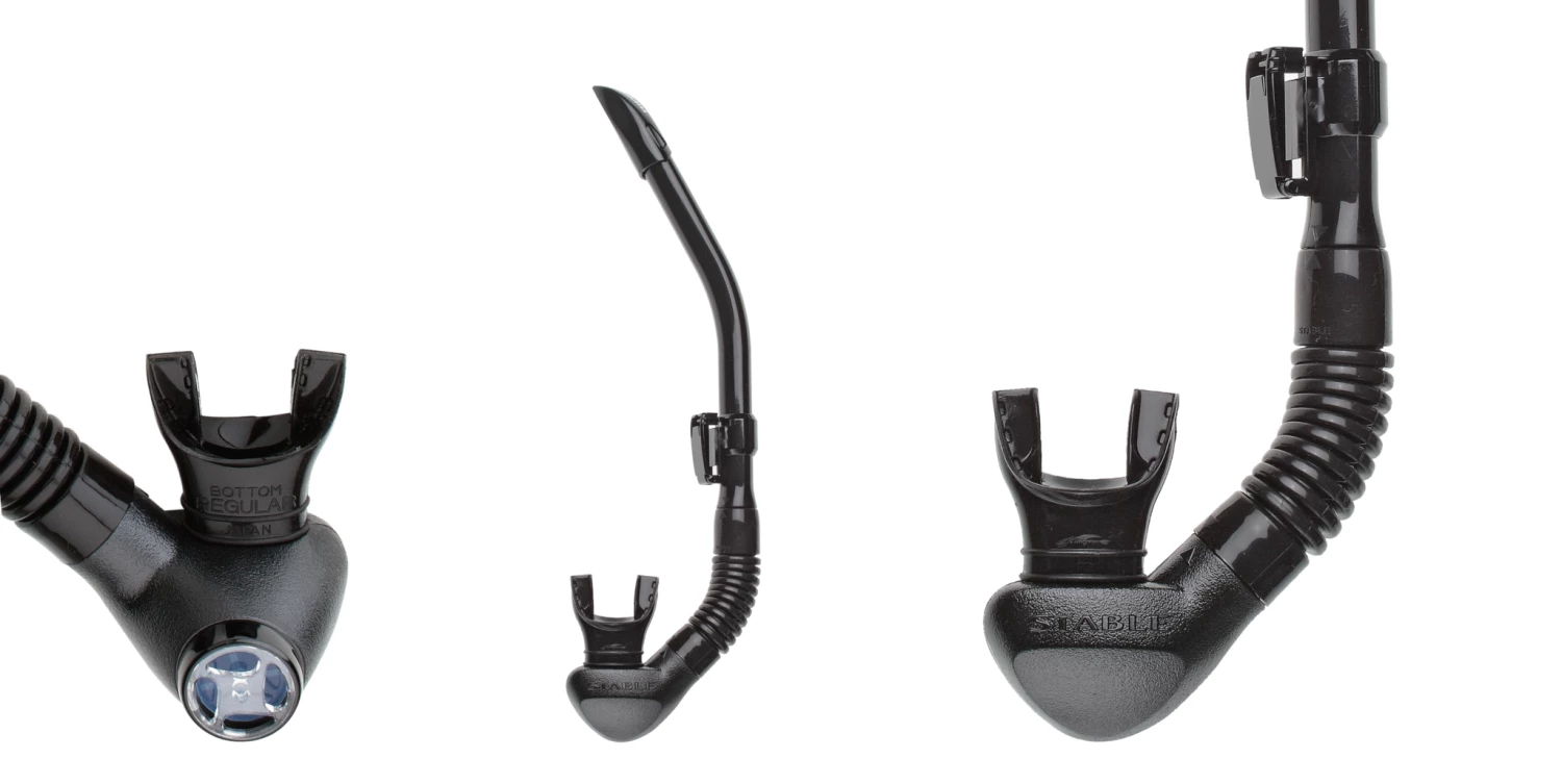 A low profile light weight snorkel with a flexible vinyl tube, giving divers the ability to fold up or stow in their BC. The dry top is shaped like a shark fin and reduces catch of line, seaweed and floating material. The Stable is the easiest clearing snorkel tested in the industry. This amazing snorkel comes with a top quality hinged snorkel keeper and has been tested by divers as a true fresh air snorkel for freedivers.