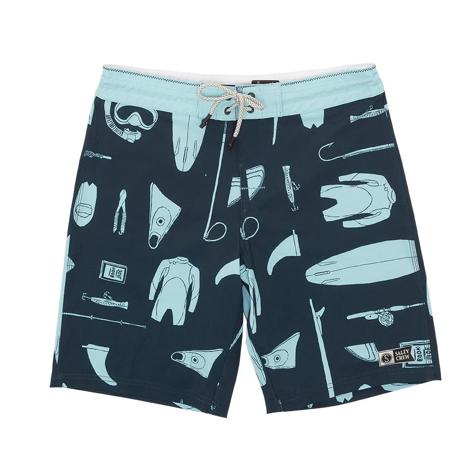 The Salty Utility boardshort in Blue is made of 92% polyester and 8% elastane. 20″ Outseam: Straight leg silhouette It features a 4 way stretch rip stop fabrication with hyper dry performance,Β printed body with salty pocket drop print,Β lasso drawcord through waistband and large back pocket w/ plier pocket for utility.