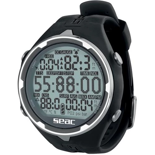 LOGBOOK MEMORY:Β SCUBA mode: 40 hours with records every 5 seconds. FREEDIVING mode: 18 hours of activity with records every 2 seconds.Β SAFETY WARNING:Β MOD exceeded alarm, deco stop violated alarm, ascent speed alarm, No Fly time and desaturation calculations, maximum permitted altitude warning. NDL only Dive Planner. Dive Manager software for MAC/PC (requires Windows 10), available free of charge at seacsub.com. Download data via USB cable (optional accessory). See SKU: SECACUSB Seac Download Cable for Action Computers. LCD screen with contrast and adjustable-intensity backlighting. Long-lasting user replaceable CR2450 battery. Computer has a maximum operational depth of 330′ (100m), can be set for use in salt or fresh water, in imperial (feet) or metric (meters) increments of measurement and has a 12 or 24-hour time mode with dual time. Computer is altitude adjustable to 9,870′ (3000m). Available in version with crown, buttons, and buckle in stainless steel. Computer comes with an owner’s manual and rubber wrist strap.