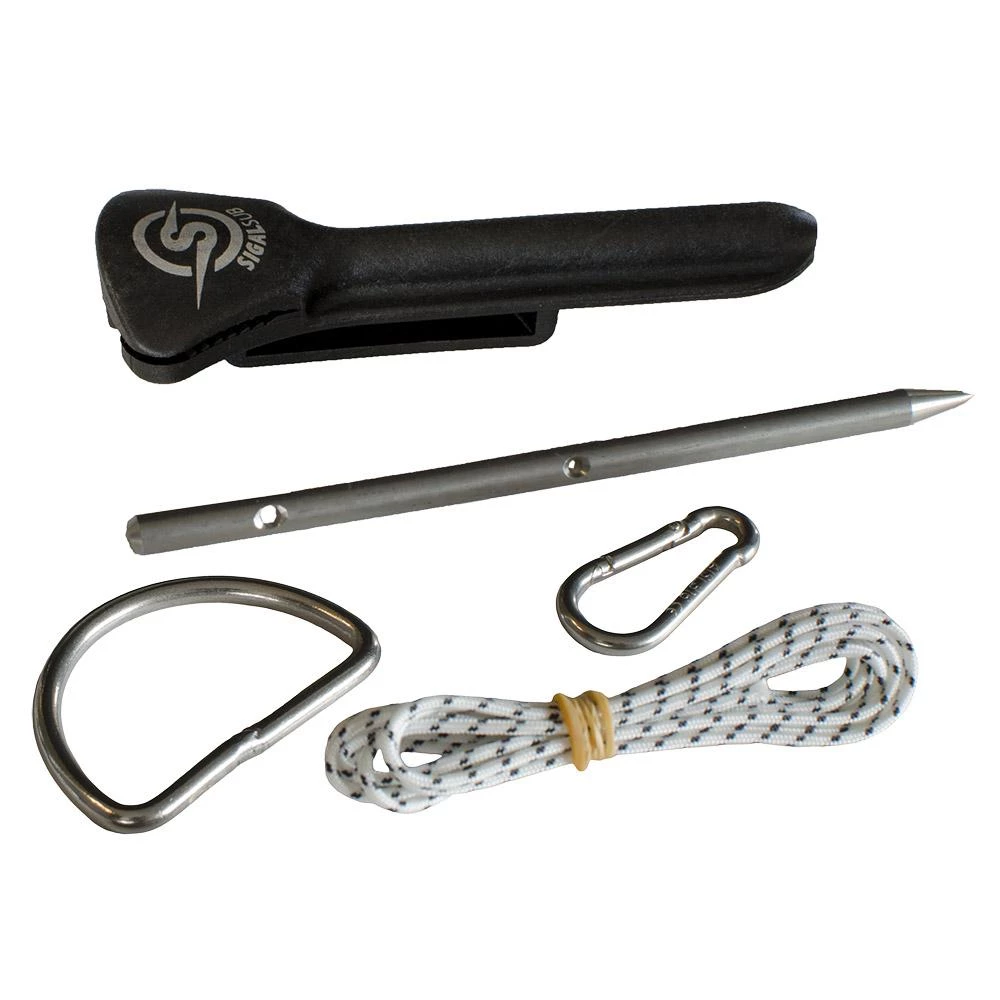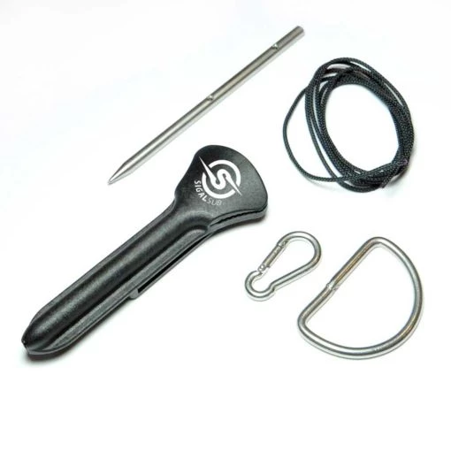 The kit includes a 2″ stainless steel D ring, a 1.25″stainless steel carabiner, and 47″ of 2mm Dyneema line.