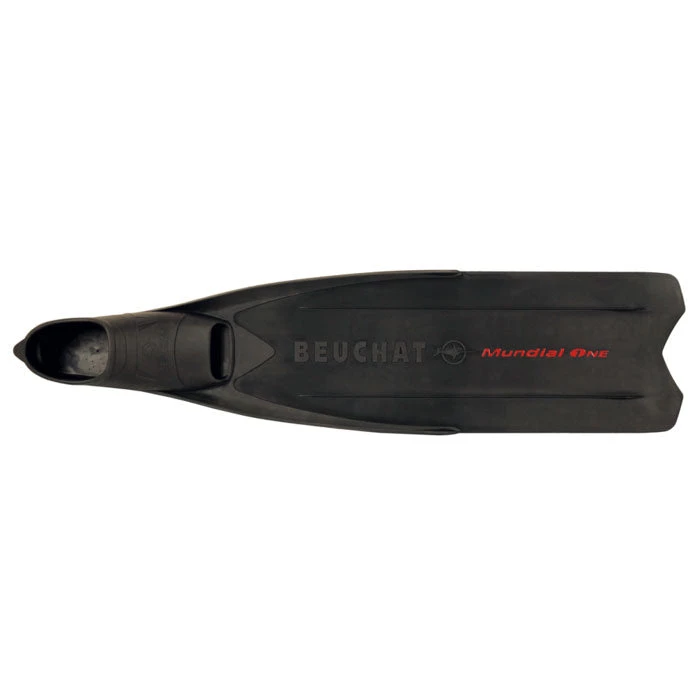The Beuchat Mundial One is designed to offer a high quality entry level full-foot long fin for divers seeking to improve their practice. For beginners and intermediate spearfishes. Highly versatile long fin with fixed blade and stabilizers integrated to foot pocket tips and on the blades. The fins fishtail shape helps to guide the blade more efficiently in the water. Comfortable, reactive foot pocket. The Mundial One is Bi-material fin, consisting of thermoplastic elastomer foot pocket (50 Shore) and techno-polymer blade. Performance, and stabilizers integrated to the foot pocket tips and to the end of the blade work in combination with the fin’s fish-tail shape to direct water flow, making it easier to guide the blade in the water and achieve a more efficient fin stroke. Foot pocket efficiency and comfort derived from Mundial foot pocket technology with reinforced instep. Fin blade measures 24″ (61 cm).