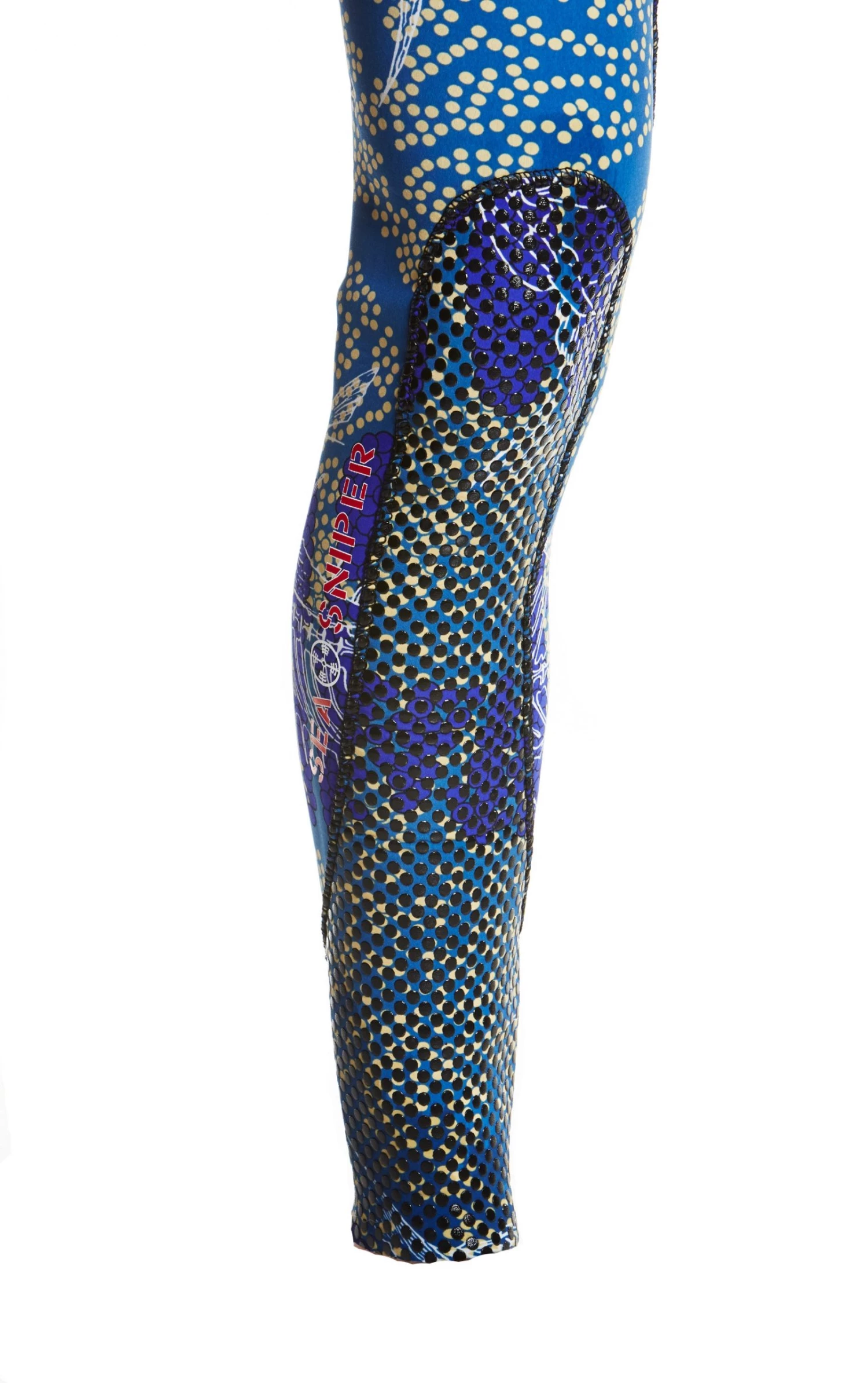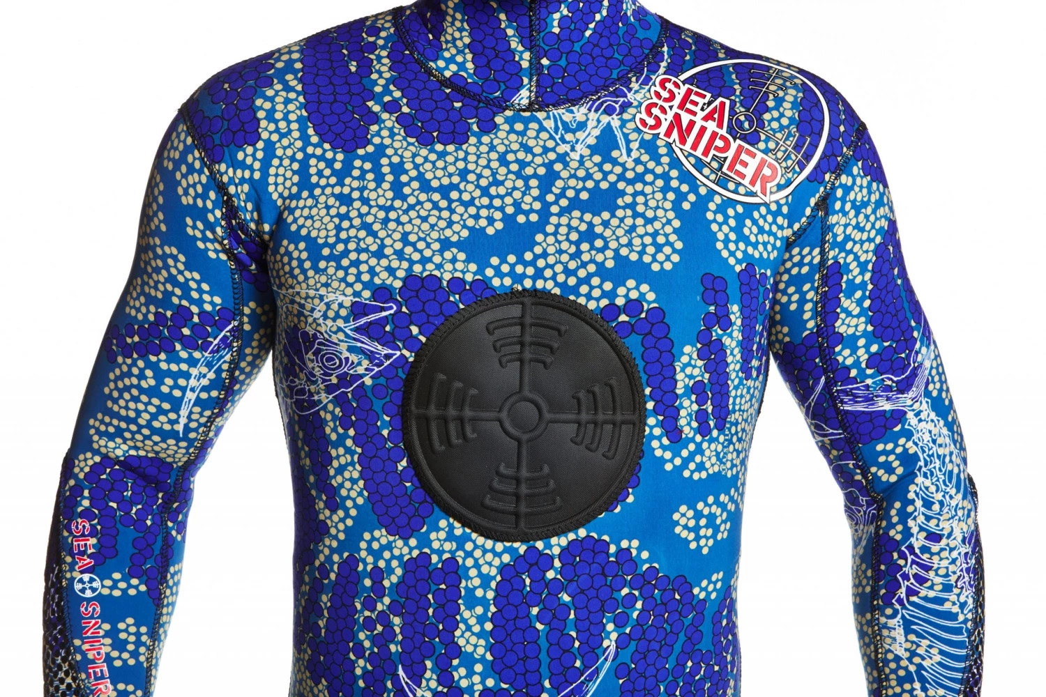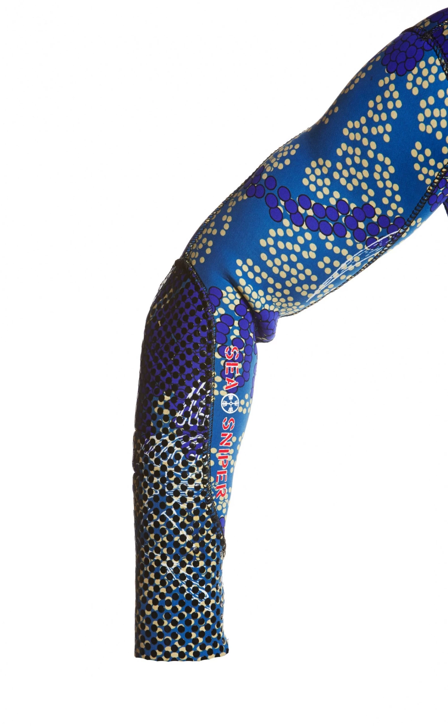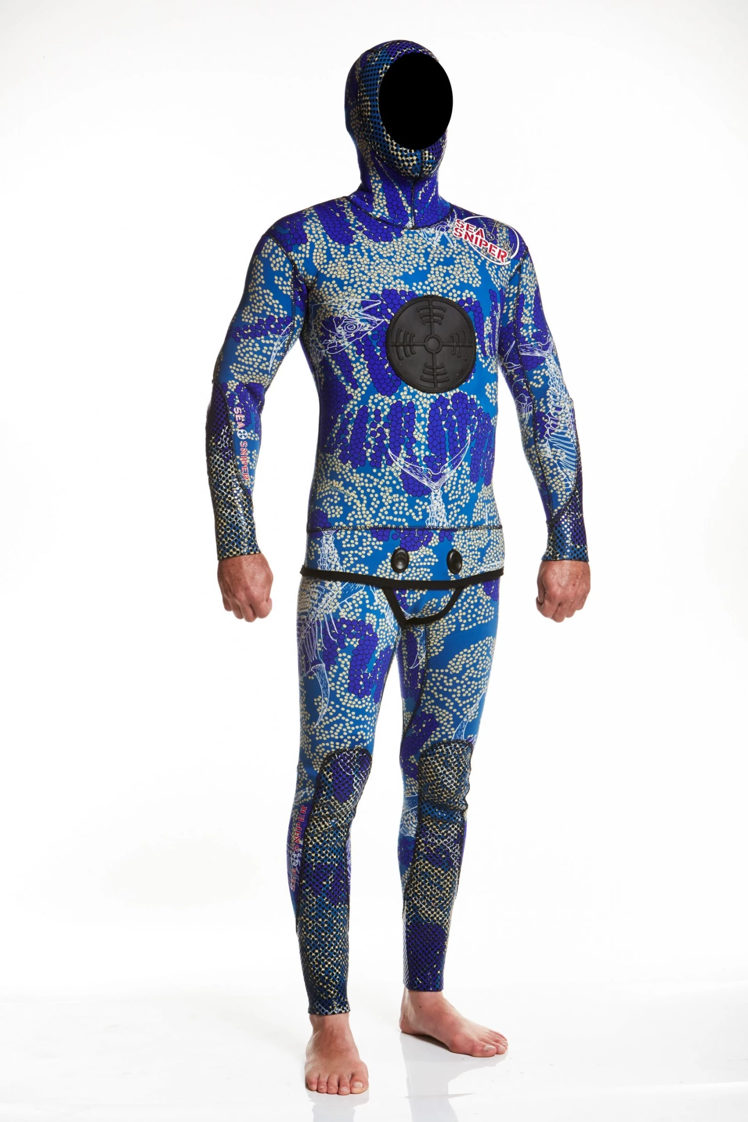 3mm Blue Camo with Yellowfin Tuna Skeletons. Features Yamamoto 39 Rubber 2 Piece Farmer John Design Custom Camo by Amadeo Bachar Scope Logo Loading Pad Ergonomic Knee and Elbow Panels. Durable Polyurethane Reinforcement Panels
