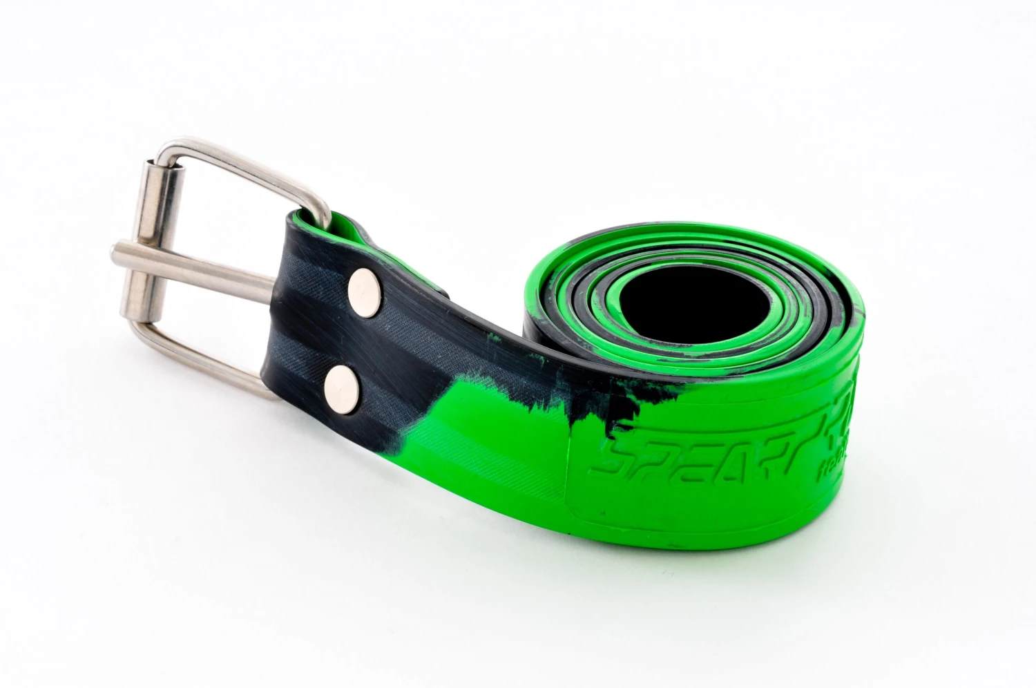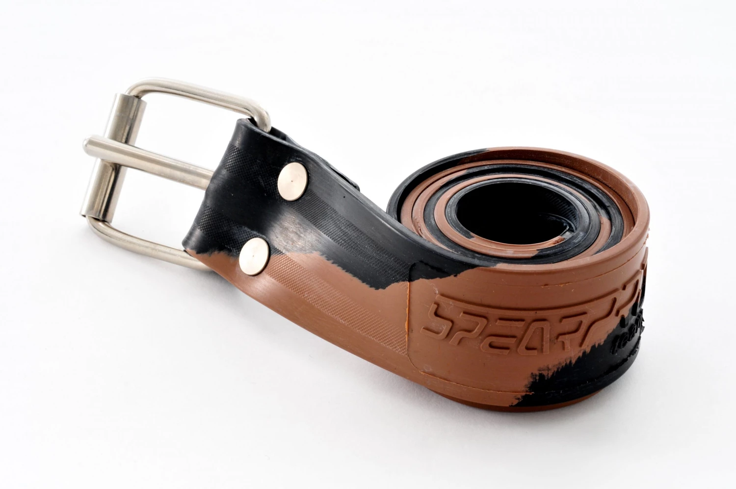 The SpearPro weight belt is made out of a mixture of materials that allow for the perfect amount of stretch (not too little, not too much) and also for a long life. Most belts in the market are either made of materials that do not flex or are made of pure latex that stretches too much and goes bad within a year.This belt is 4mm thick and can be loaded with up to 30lb of weight. and comes in various camo paterns