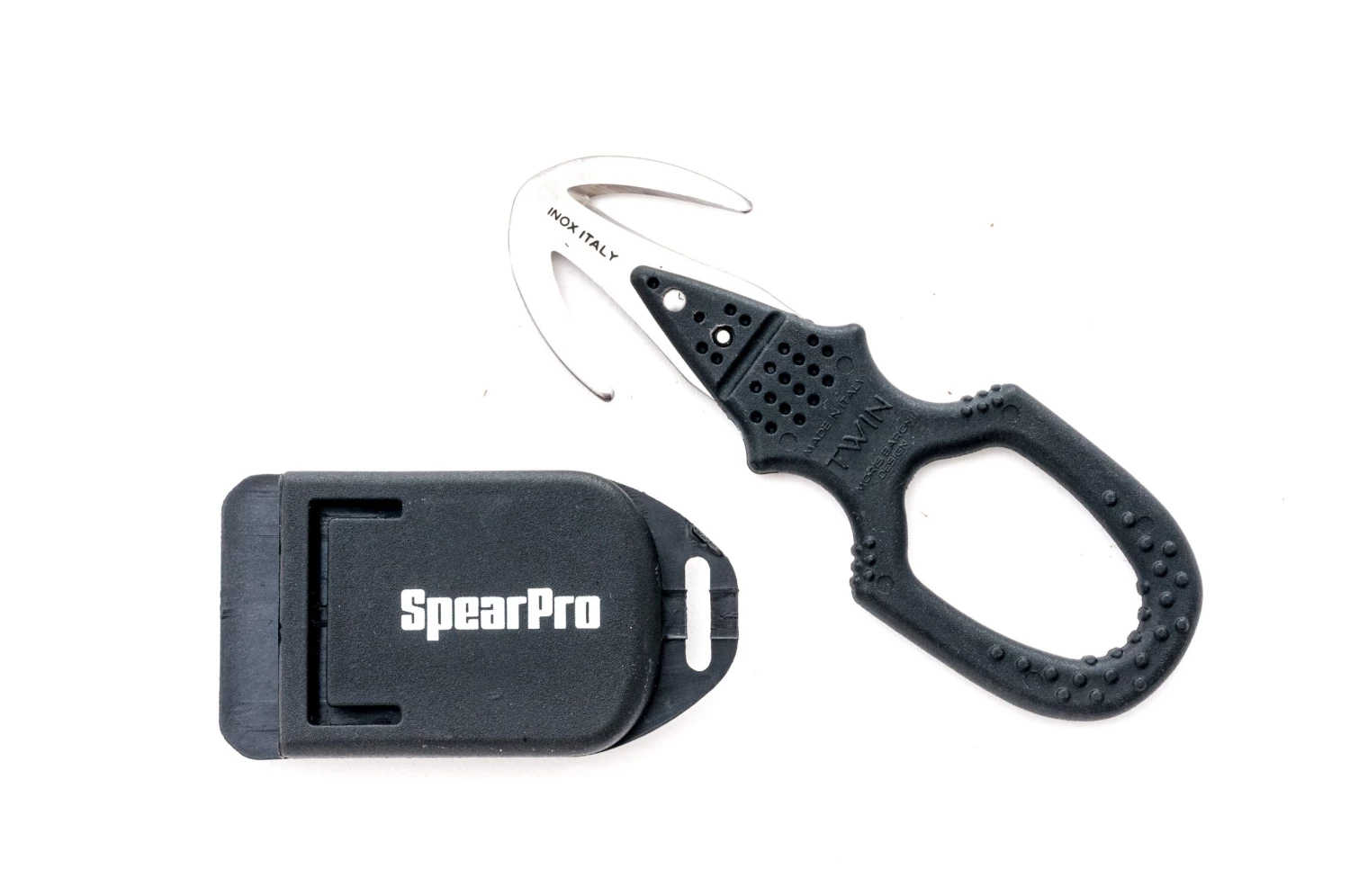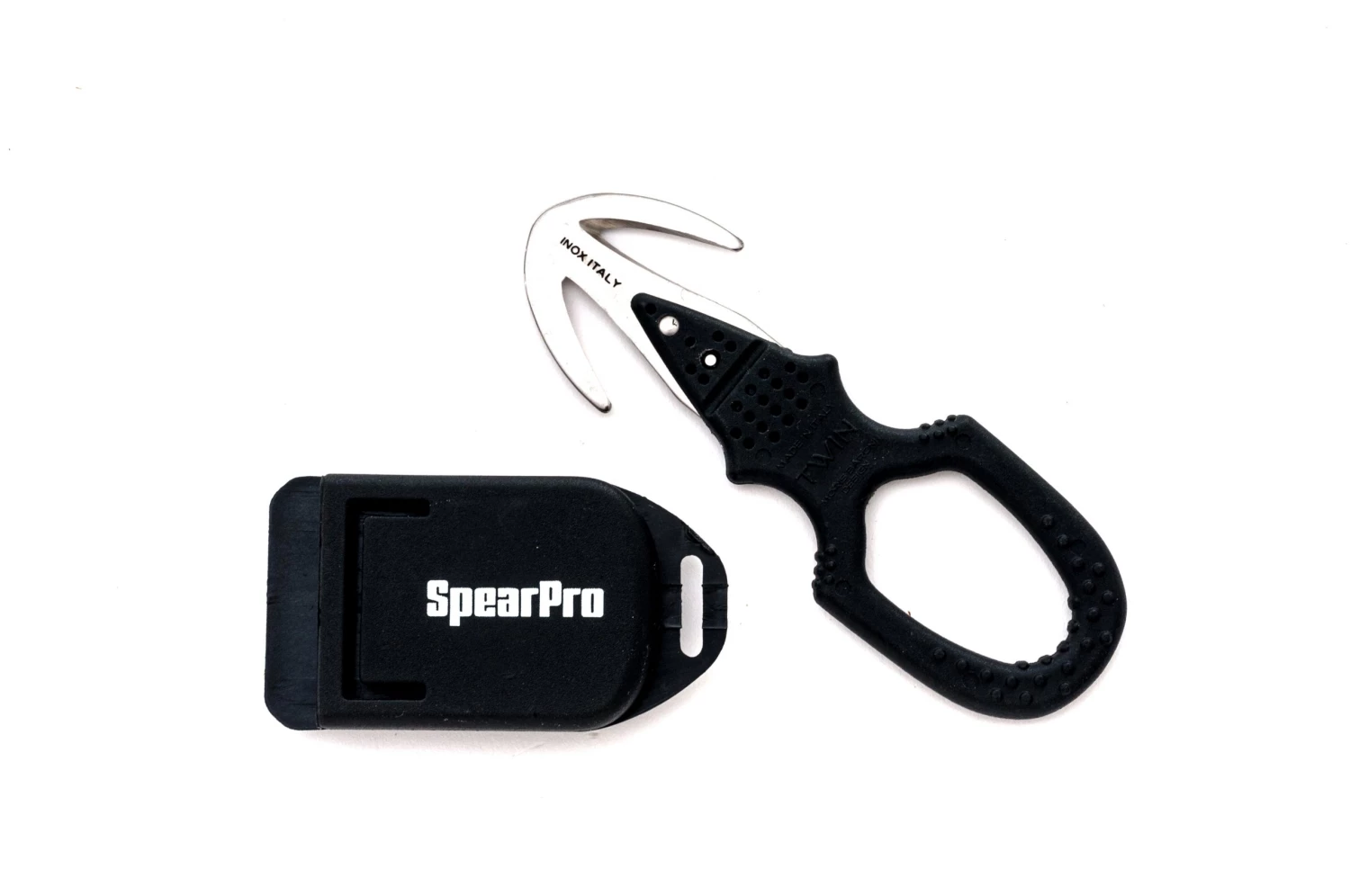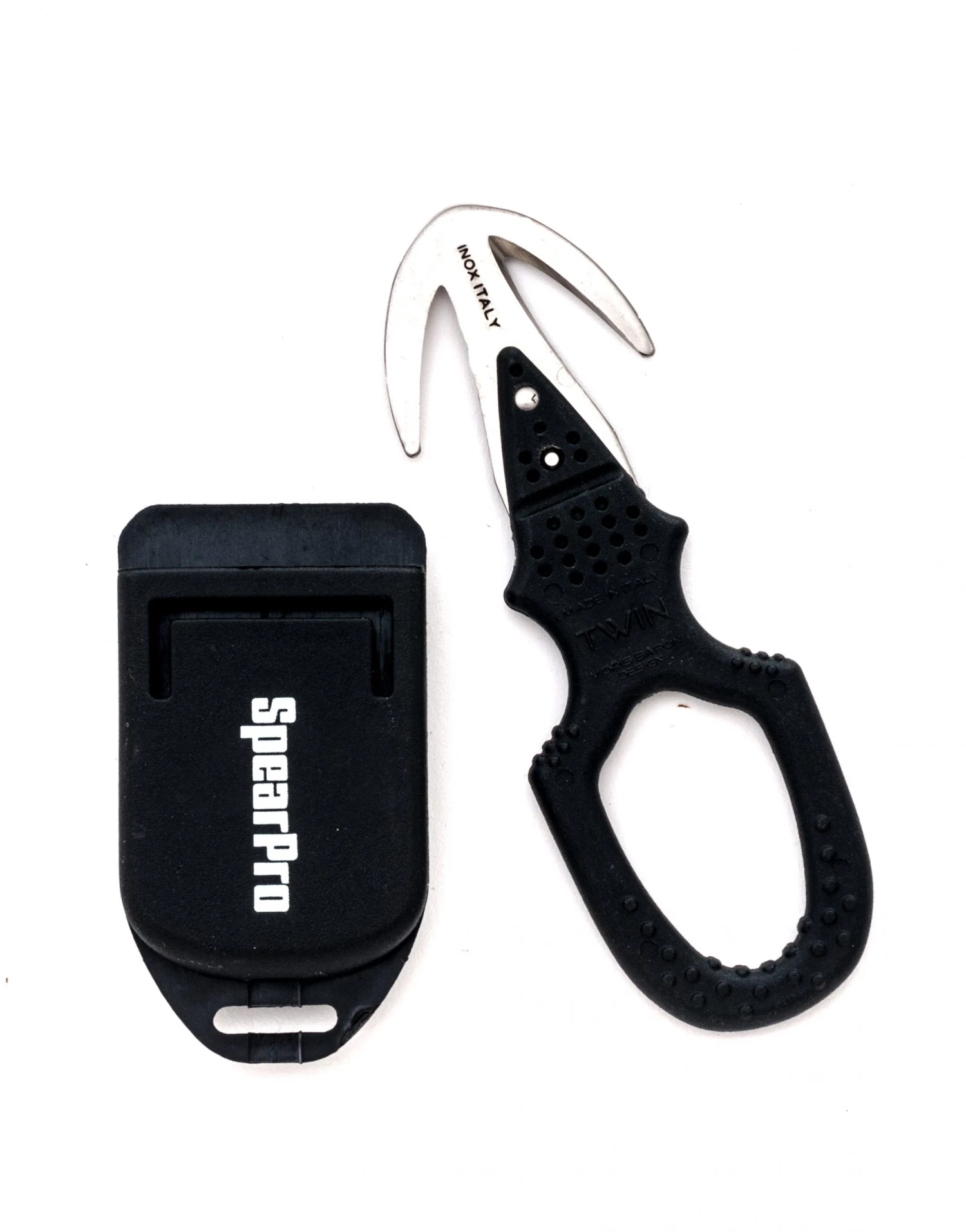 TheΒ SpearProΒ TwinΒ Line Cutter is a twin safety blade line cutter with a hard plastic protective sheath that can be mounted onto 50 mm (2 inch) webbing.