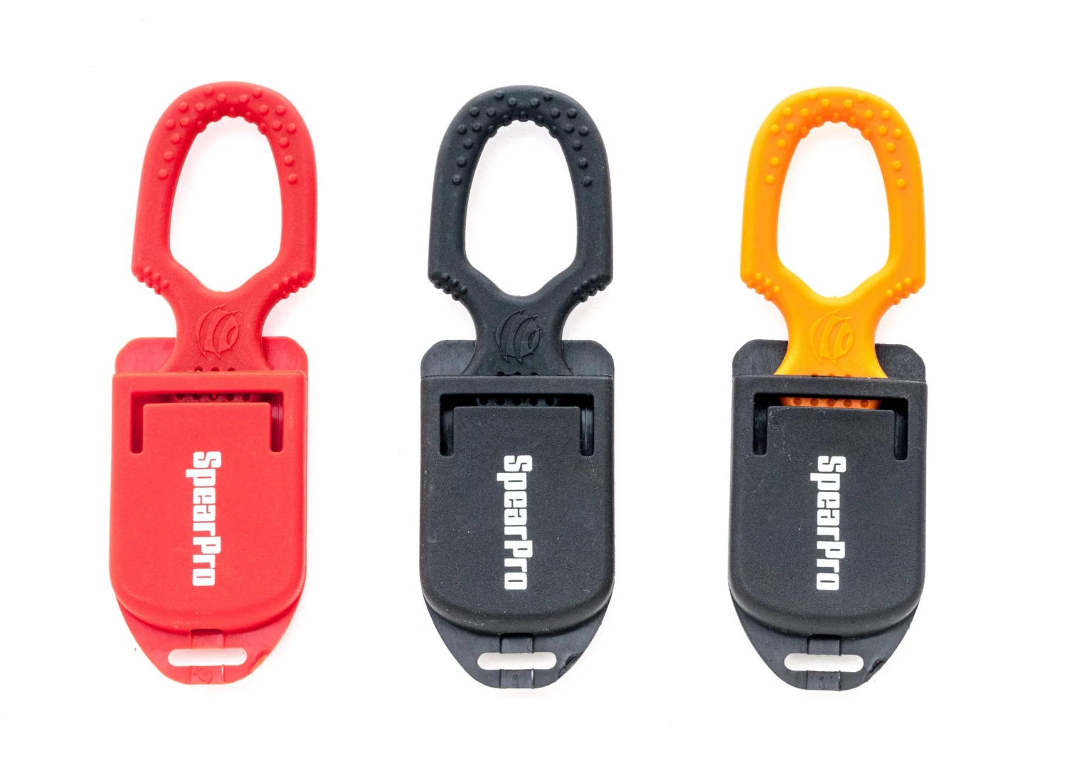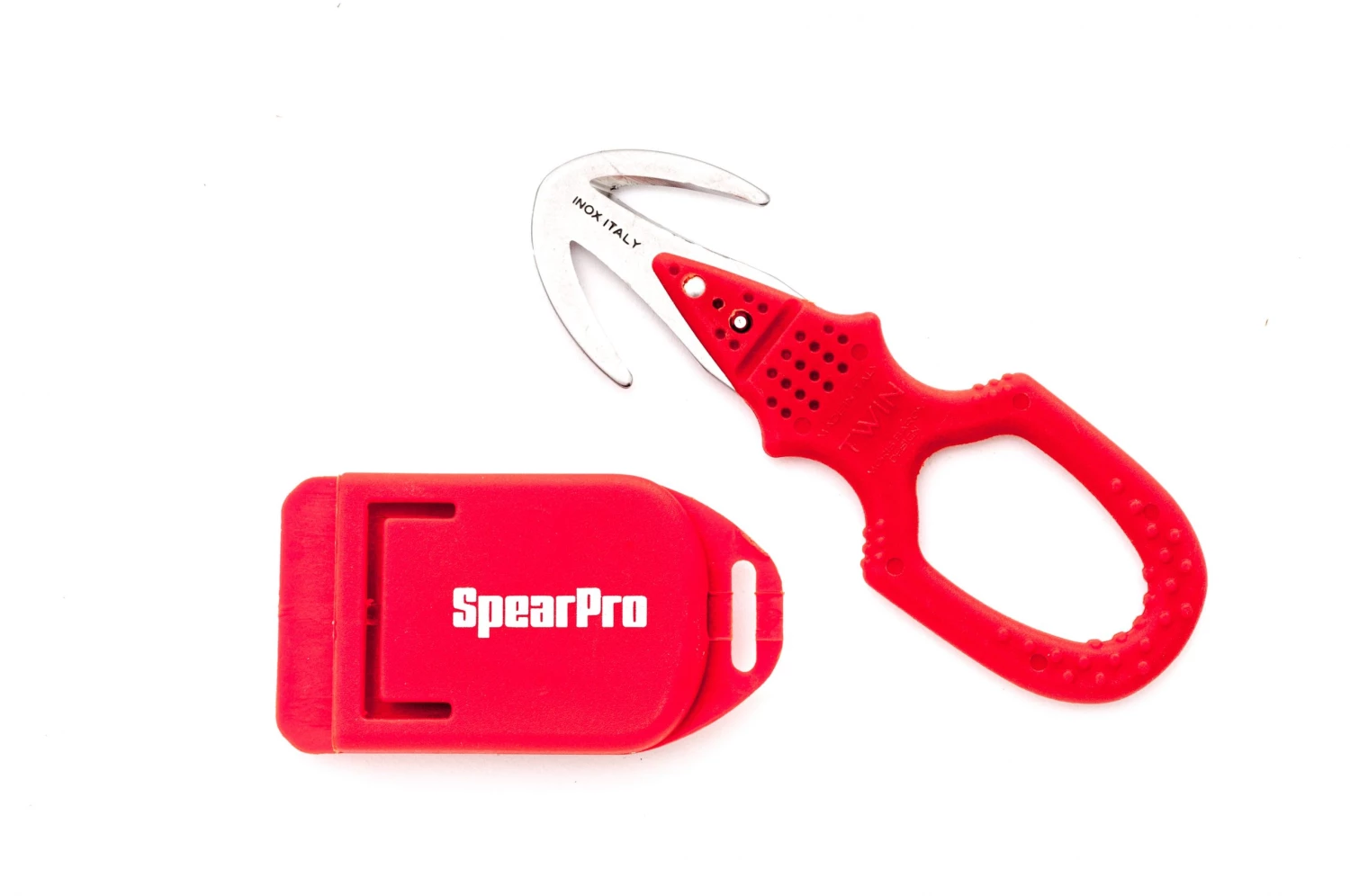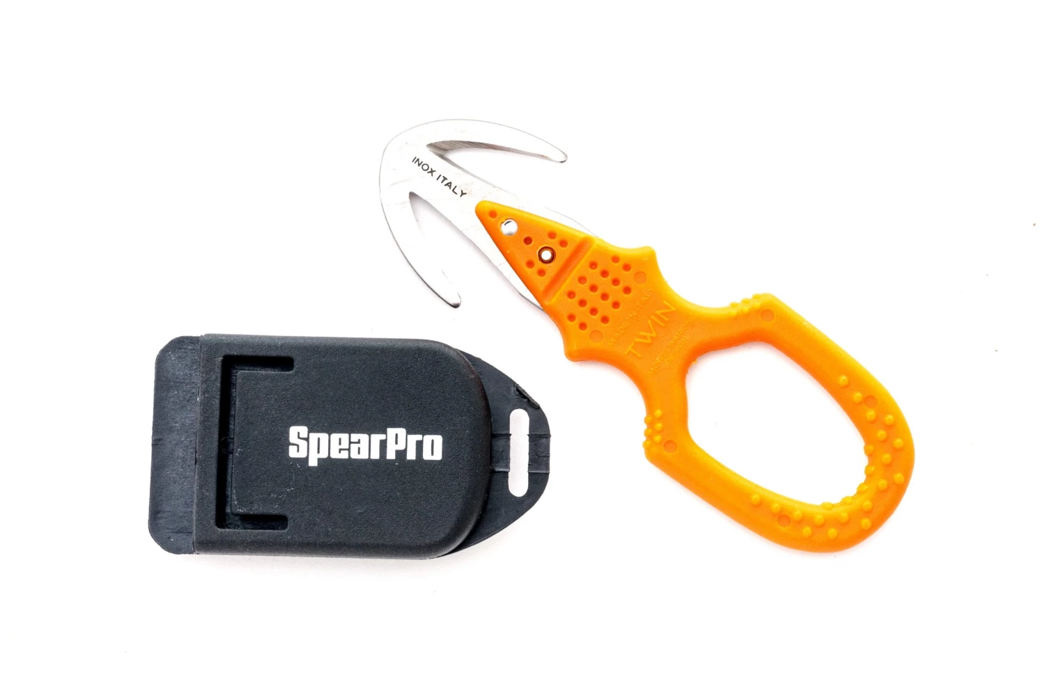 TheΒ SpearProΒ TwinΒ Line Cutter is a twin safety blade line cutter with a hard plastic protective sheath that can be mounted onto 50 mm (2 inch) webbing.