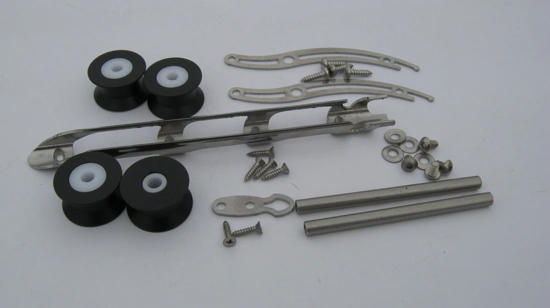 the Ermes Double roller kit includes: 2 pairs of pulleys 16 x 28 Sliding groove 19 width 14 or 16 mm; 2 x 82 6 axes with 4 screws M4 x 6 1 stopper tube 170 with 3 screws self-tapp. 2.9 x 13 1 pair long wave shores with 4 screws self-tapp. round head 3.5 x 13 1 scroll-line transformer Glass configuration : 2 pulleys with Glass bearings 6 x 19 x 6